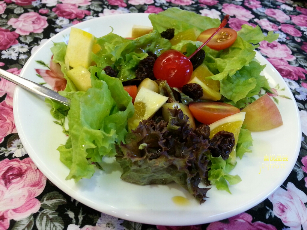 | 沙拉里有番茄,葡萄干,生菜,苹果,橙等等...味道不错吃~ 但吃到最后感觉有点甜腻... |